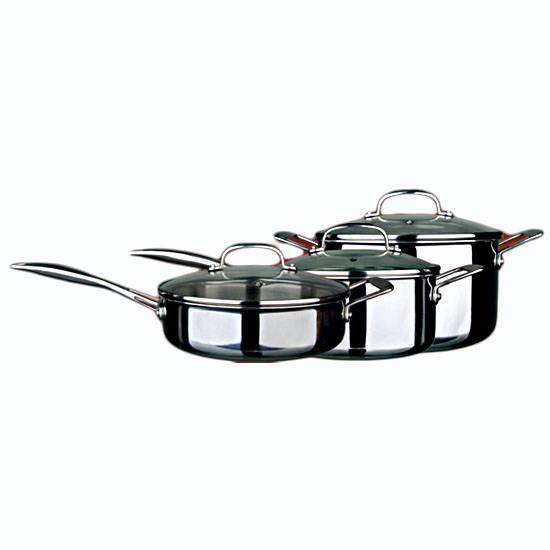 This set of stainless steel pot has three cookware items. Each pot comes with a lid and a comfortable handle. This set of items is of a traditional style and will work in the most modern kitchens.