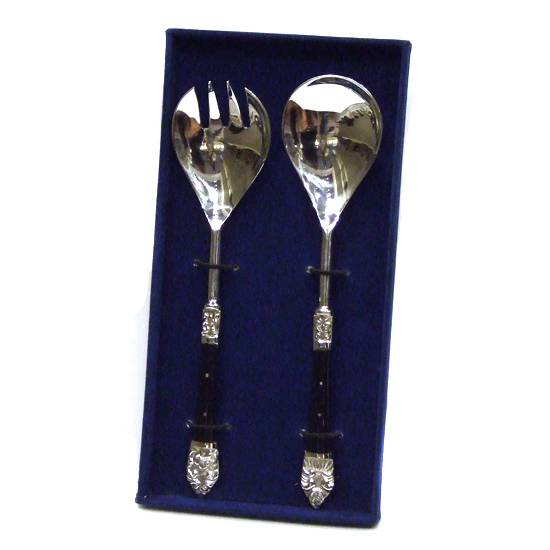 This is a set of fork and spoon for serving salad. They are made of stainless steel and the handles are covered with resin. This salad serving set comes with mirror finish and is of oriental style.