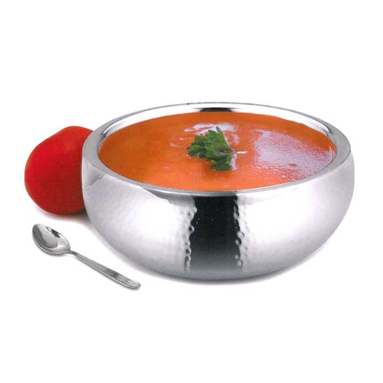 Showcased here is a soup bowl with a trendy design. Made of stainless steel, the bowl is strong and durable. It comes with a plain design and a wide mouth for heat dispersing.