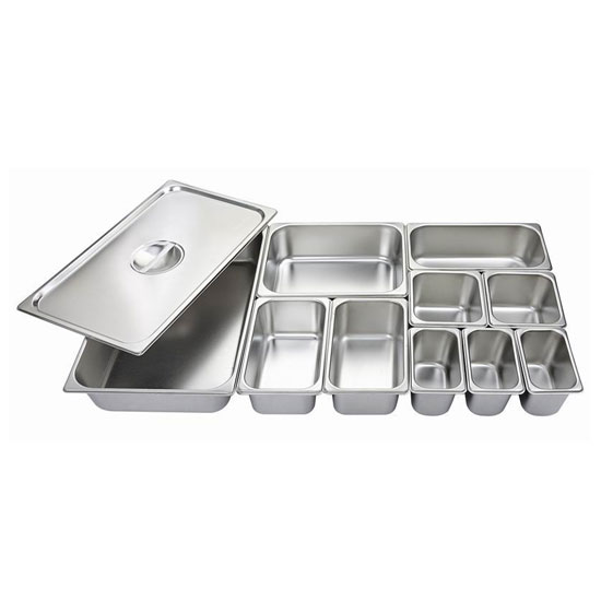 Presented to you is a stainless steel steam pan  for keeping kitchen utensils. It features assorted compartments for sorting the kitchen articles in an organized way.