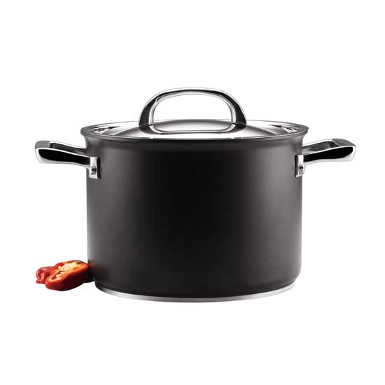 This stainless steel stockpot comes with riveted handles for reliable carrying. The hard anodized body is twice as hard as stainless steel for outstanding durability. The stainless-steel-clad base is fully encapsulated for fast and even heat distribution.
