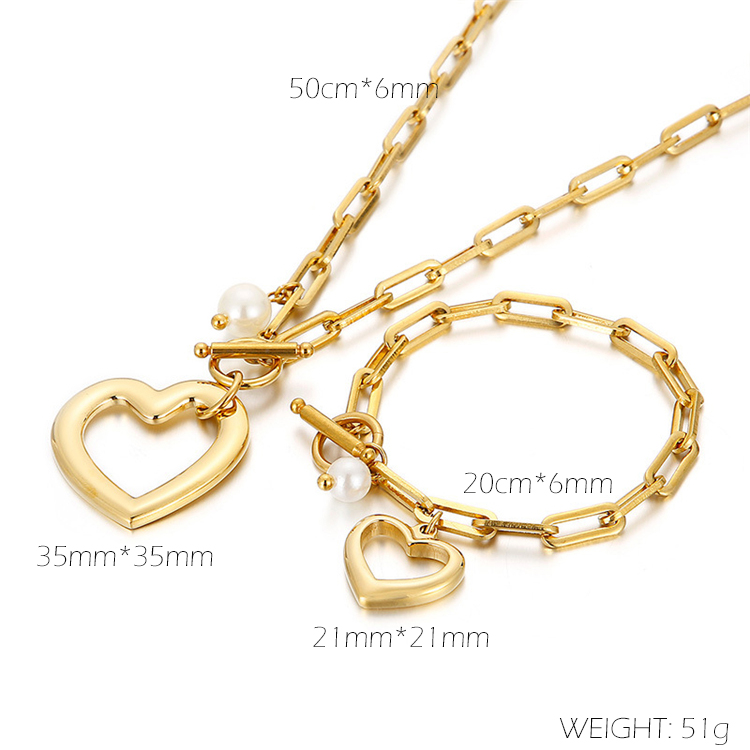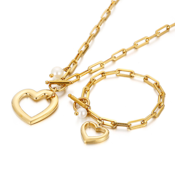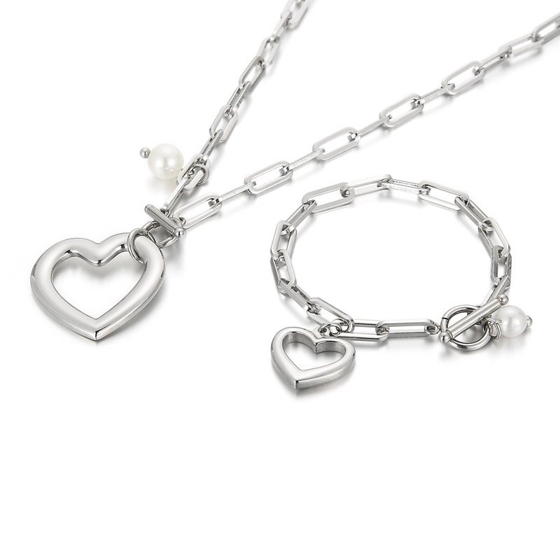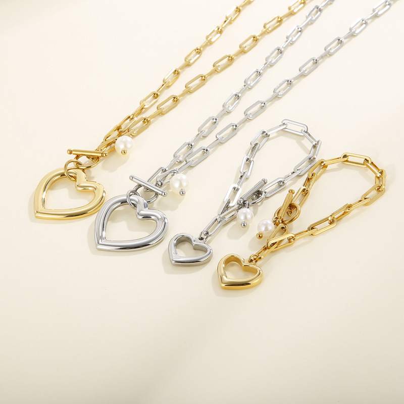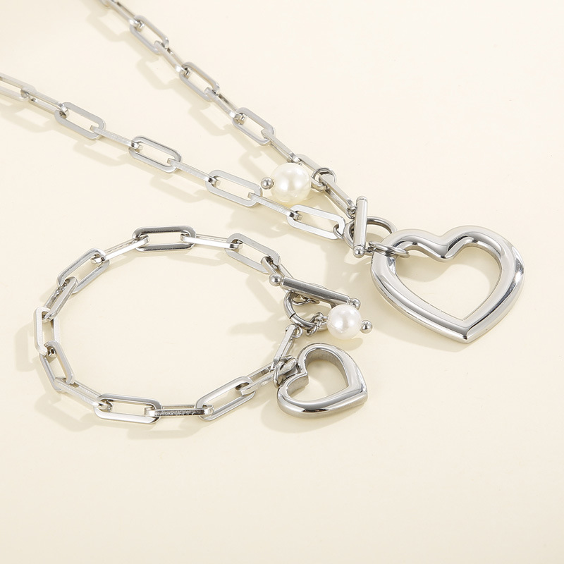 Stainless Steel Thick Chain OT Buckle Heart Shaped Bracelet Necklace Set