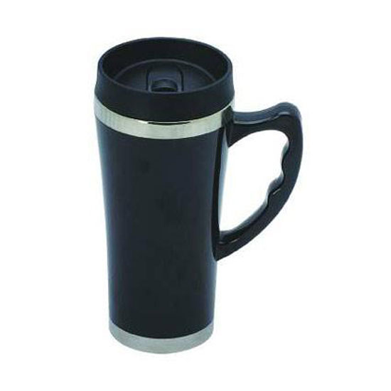 This finely made travel mug flaunts a plastic inner surface and a stainless steel outer surface to effectively retain the temperature of a drink. The ergonomic side handle promotes an easy and comfortable grip of the mug. The matching lid prevents spilling as you are on the road.