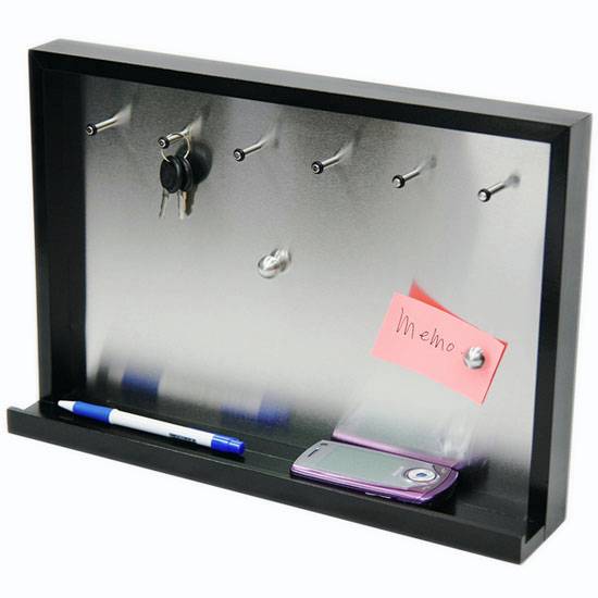 This novel wall organizer smartly combines a memo board and a shelf for maximum utilization of space. The contemporary rectangular-shaped design is nicely complemented by the sleek black wooden frame. The wall organizer comes with 6 hooks for you to hang your keys.
