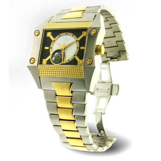 The watch here boasts a classy appearance for modern gentlemen. The case and strap are made of stainless steel and plated in silvery and golden. The rectangular case is adorned with screws and embossment for enhanced style.
