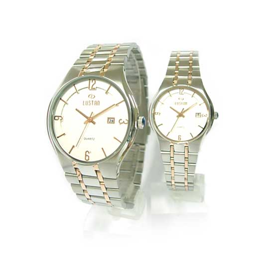 This stainless steel watch features a classic design with a white dial and a link-style watchband. Copper colored quarter time markers and watch hands echo the copper detail on the watchband. The small date display window adds extra practicality and detail to this timepiece.