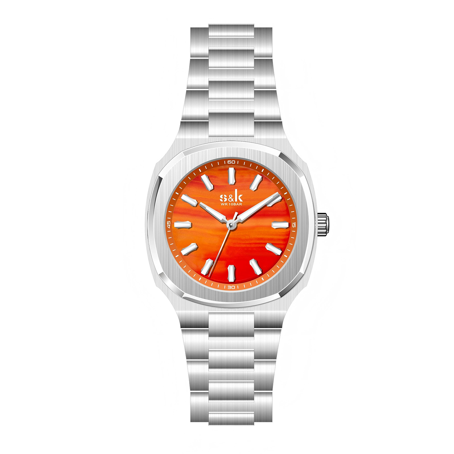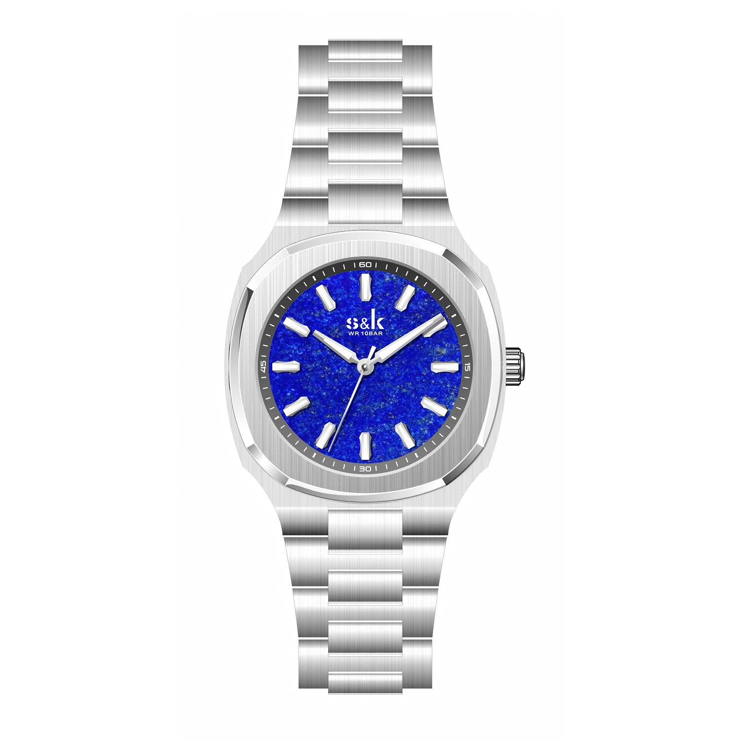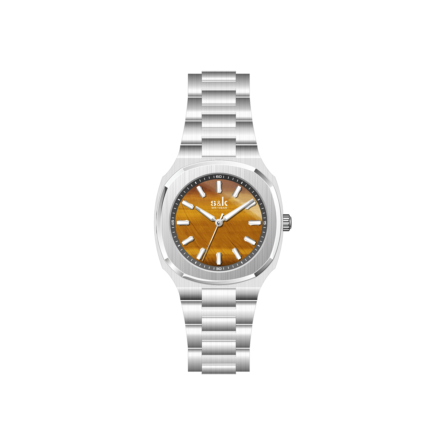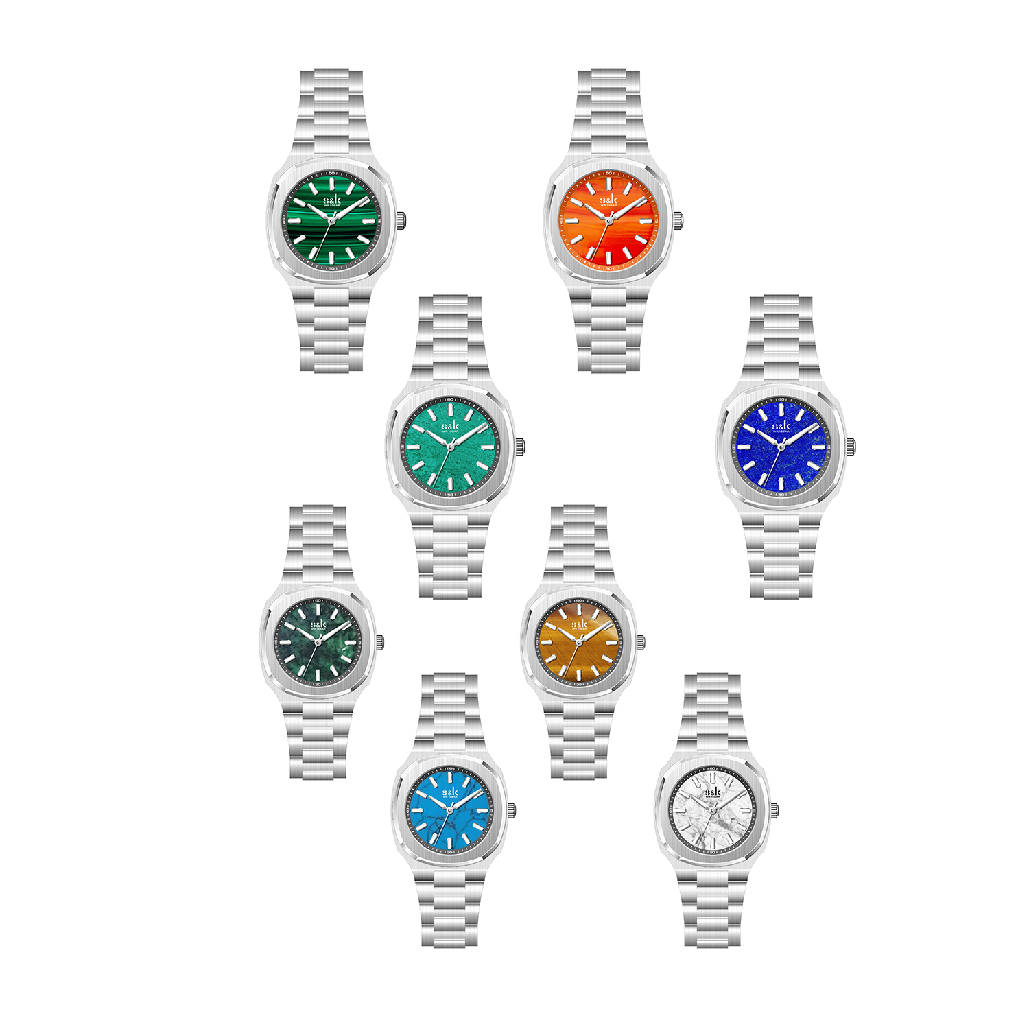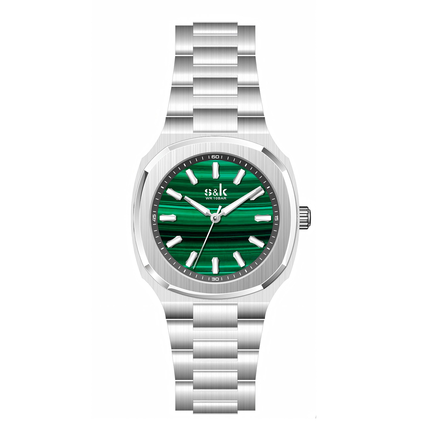 This minimalist Stainless Steel Watch showcases a robust case size ranging from approximately 38 to 45 mm, and it is built to withstand everyday splashes with a 10 ATM water resistance rating. Powered by a precise movement, it is finished with sleek stick hands set against an ombre, malachite dial to strike a perfect balance between visual appeal and legibility.