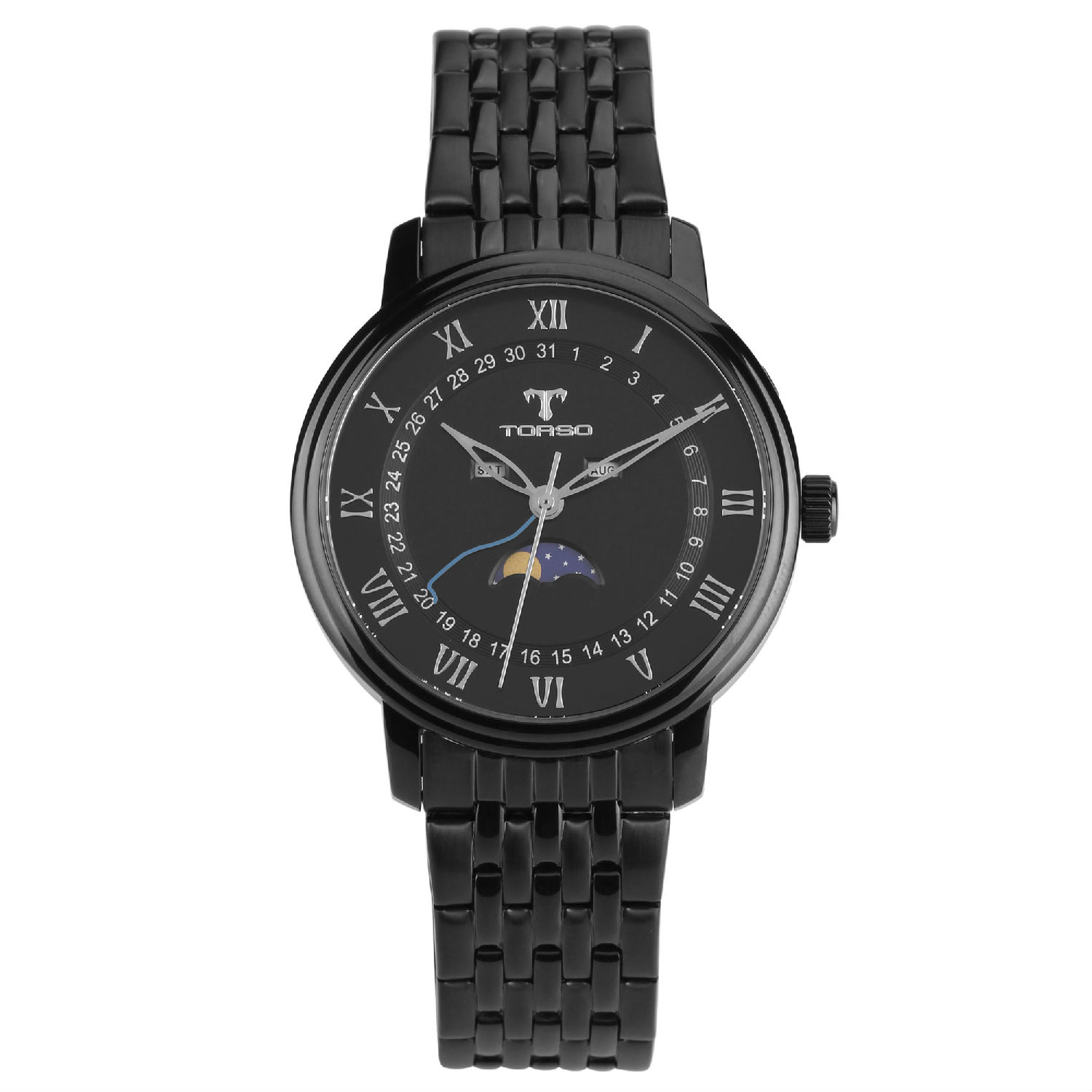 Designed in all-over black with stainless steel rigidity, this stylish watch boasts longer lasting durability that serves as a reliable time keeper and time-honoured wrist accessory for years. It has a round dial topped with contrasting details, showcasing the time and full calendar with 4 rotating hands, multiple windows, and Roman numerals.
