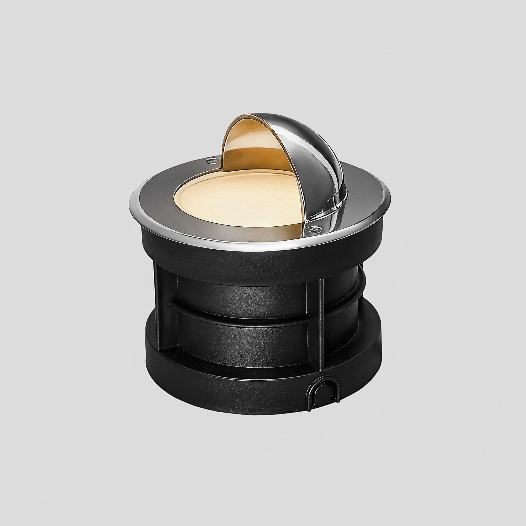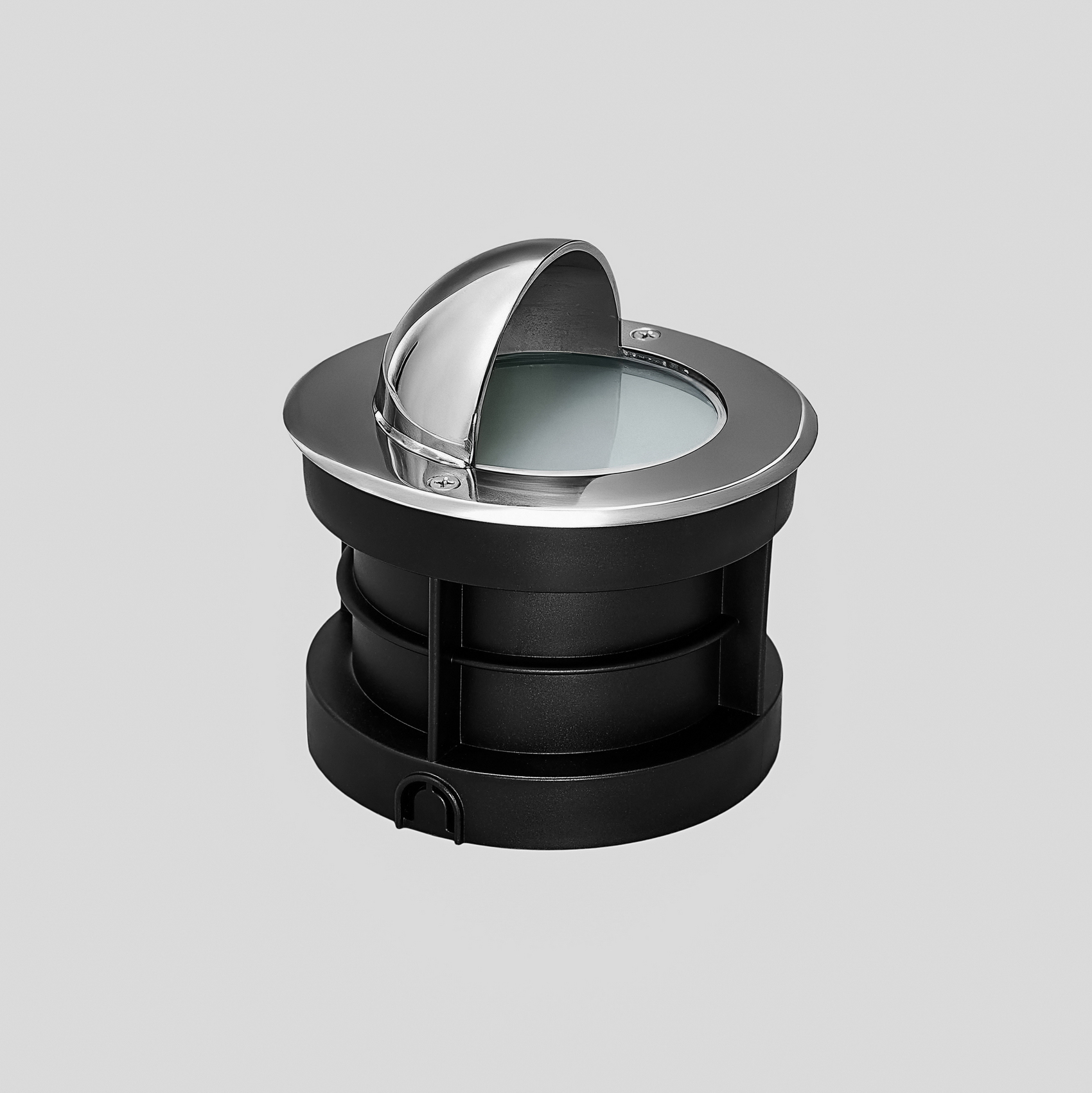 Stainless steel burried light with halfmoon cover rim, slim housing in height, Osram SMD LED modular lamp.