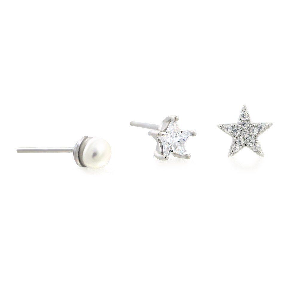 Stud Earring Set Star With Pearl has stunning star earrings with tiny cute pearl earrings, there are so many fabulous colors to suit all tastes. You may change to plating colors to rose gold or gold, can change cubic zirconia and pearl to whatever colors you wish to have. Each pair of earrings are made with surgical posts which include backings of your choice! (see photo). The surgical post is the perfect material for anyone who suffers from metal allergies and discomfort that often comes with wearing other types of metal earrings.