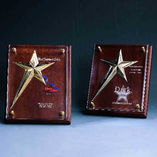 This wooden plaque spotlights a brushed metal star with etched words and logos. The plaque is covered with a transparent acrylic board with four screws on the corners. It makes an excellent prize option for various competitions.