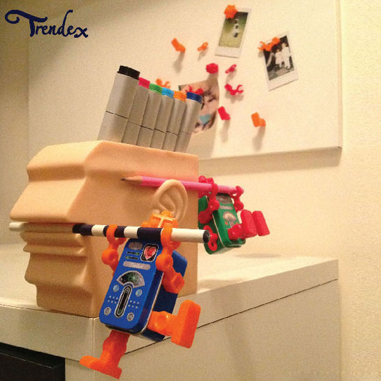 Tinbot is a tin-made robot with magnetic hands and legs which can help you to hold pictures, memos, and perform entertainment for you. The FaceHook is a stationery holder with a unique design. These two items can be used together for an interesting and practical addition to your desktop.
