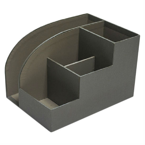 This monotone stationery organizer features a 3-step design with compartments for various uses. There is a letter holder with rounded corners on the side, one relatively shallow stationery or memo pad holder in the front and three pen cups in the middle and at the rear part.