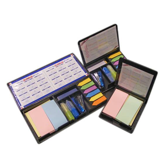 These are stationery set which includes adhesive memo pads, highlighters and staplers etc. The statonery are put in a black coloured immitation leather case.