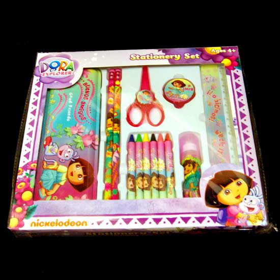 Displayed here is a stationery set that comes with different items. It includes a pencil case, two pencils, scissors, a ruler, etc. The stationery items come with colorful appearances and are decorated by lovely cartoons.