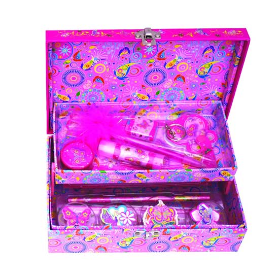 The stationery set is designed with a gift box in colorful printing pattern. The box features two tiers for enough capacity to store various stationery such as erasers, pencils etc. The easy-to-clip mechanism allows for easy storage.