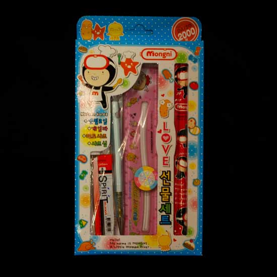 Featured is a set of stationery that includes pencils, rulers, pens and more. The character Mongni lives together with her friends on 'Mara Island' located on the Southern ocean, and lives happily while working as a tour guide for tourists who visit from time to time. The set makes a nice gift for young Mongni fans.
