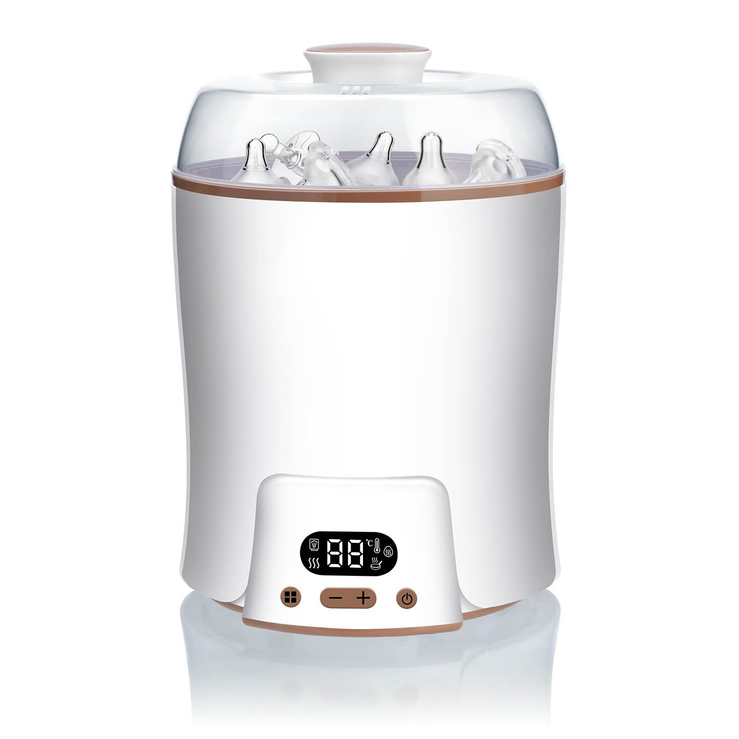 This versatile and efficient steam bottle sterilizer goes beyond sterilizing, offering an all-in-one solution for the baby's feeding and dining needs, including sterilizing milk bottles, heating milk up, keeping warm, steaming baby food, and boiling eggs. It uses the power of steam to quickly eliminate 99.9% of household bacteria without chemicals, ensuring a safe and efficient meal for the baby. Designed with a large capacity, the device accommodates up to six standard or five wide-necked bottles and accessories simultaneously, making it highly efficient for busy parents. With its sleek and space-saving design, the sterilizer that fits perfectly in any kitchen is an ideal helper for parents.