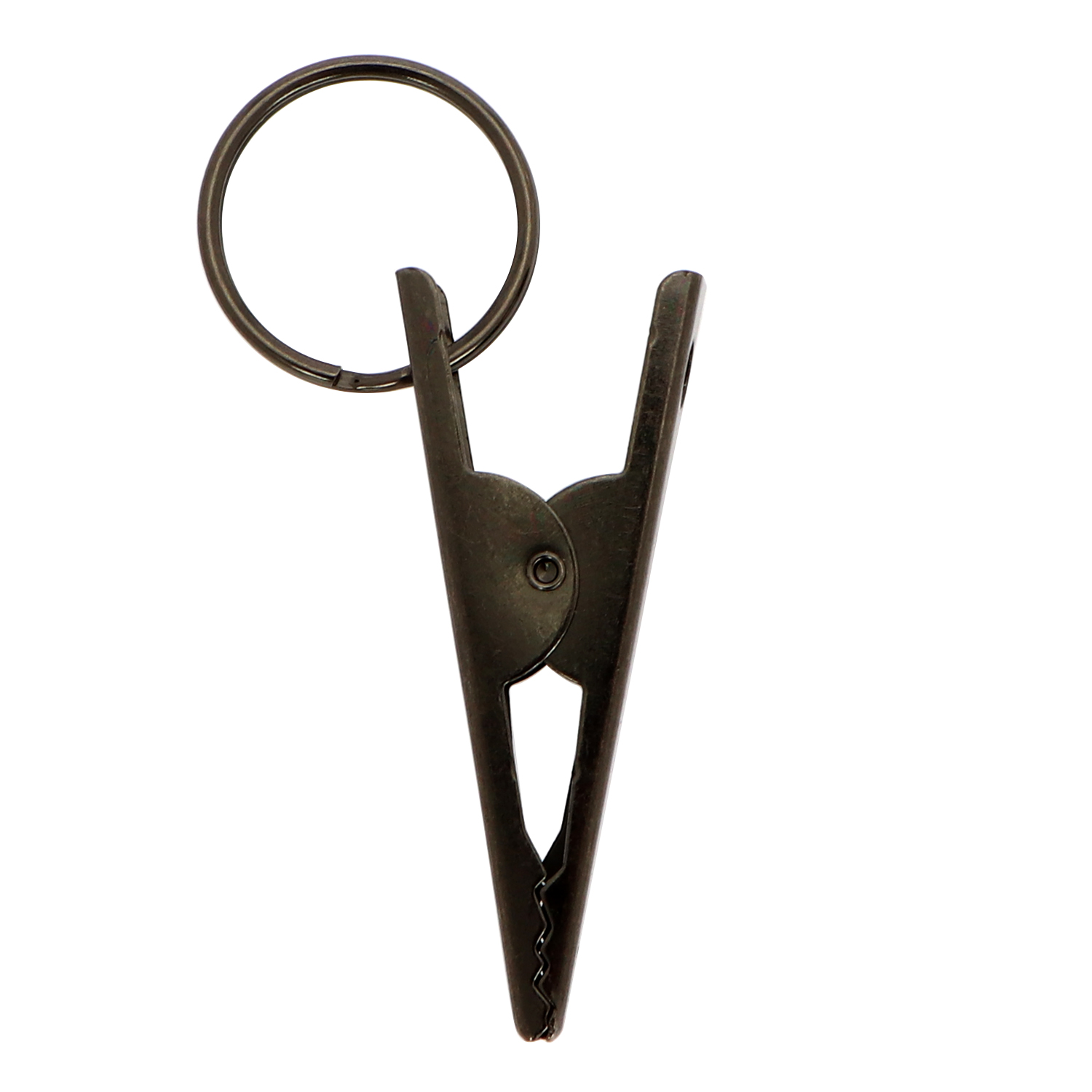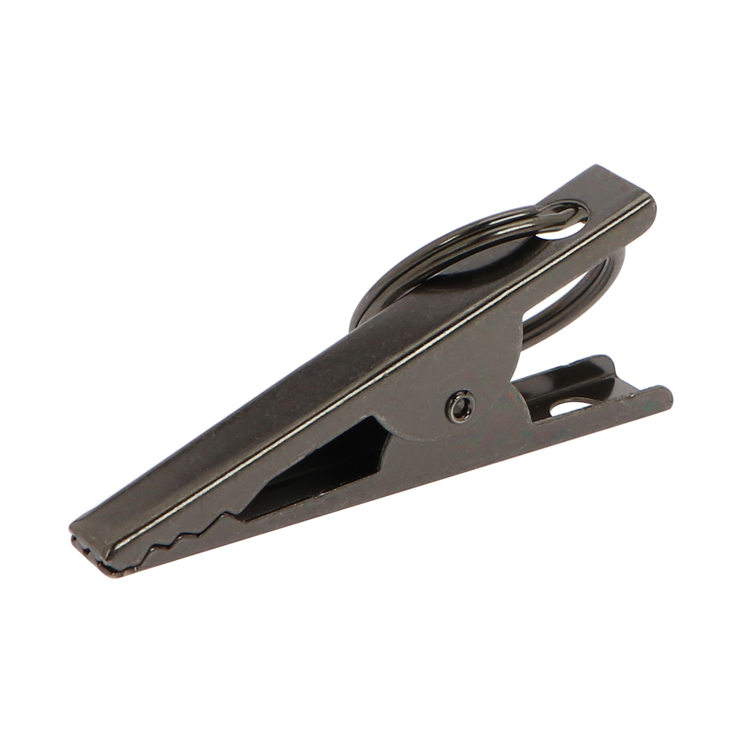 This crocodile clip is made of steel and has serrated jaws to ensure a firm grip. It has holes on the body and is attached with a round split key ring. The crocodile clip flaunts outstanding durability and is excellent for using as a connector.