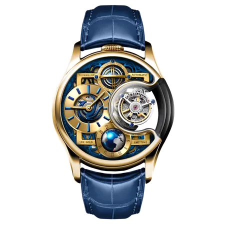 The tourbillon located at 3 o’clock rotate at a speed of 60s for one circle The balance wheel and the escapement system encircle the center of balance wheel Flying tourbillon 40 hours power reserve Sphere GMT indicator 18-Karat gold / white gold Chinese ancient planetarium featured decoration (12 o’clock) Self-winding mechanism with 18-Karat gold coin on the rotor (Bi-Directional Winding) Alligator Strap Special made sapphire crystal