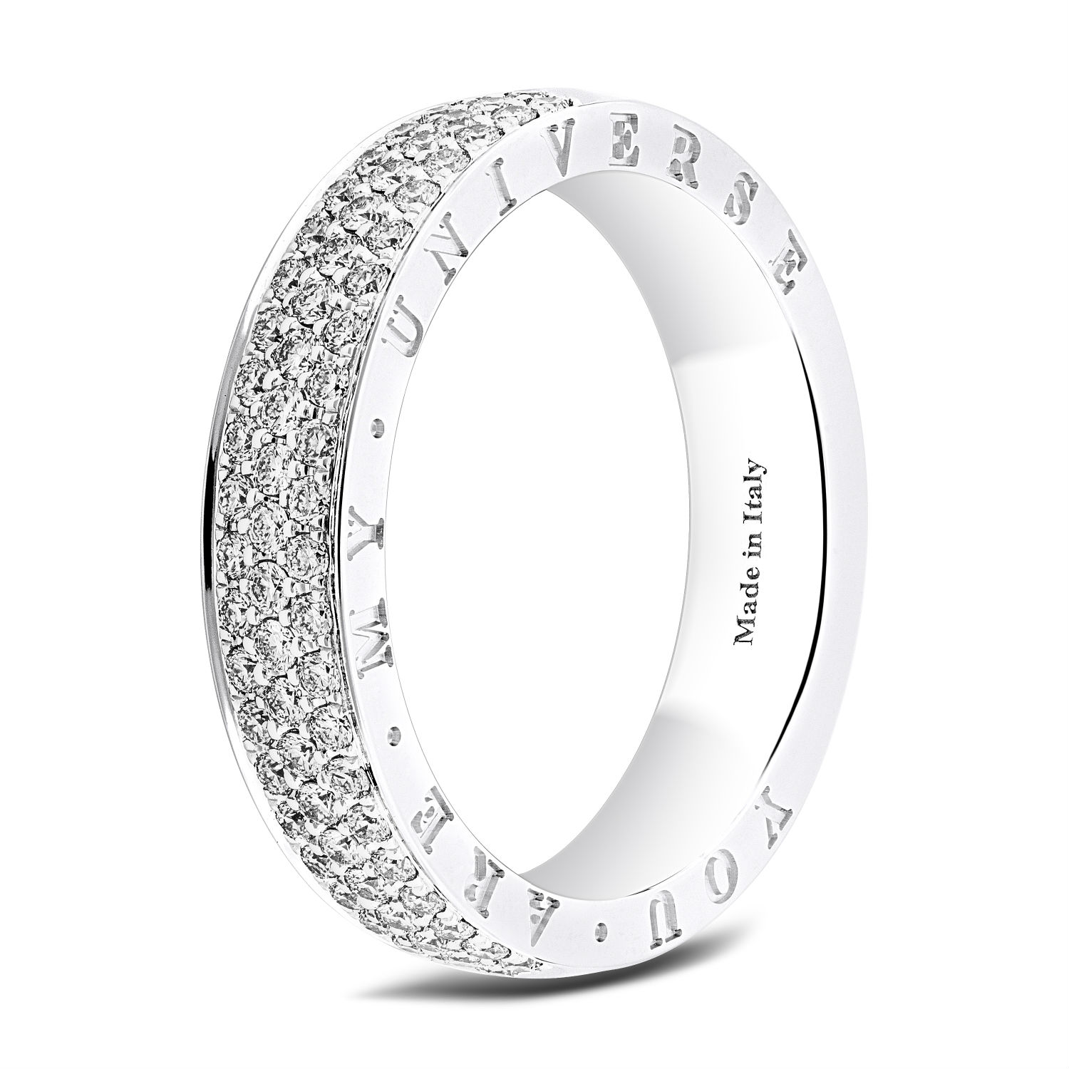 • This glorious wide gold band is illuminated by three rows of diamonds in pave settings. Clean lines make the ring a sublime and modern design. Every wedding band is engraved on one side with the declaration of love, You are my universe.