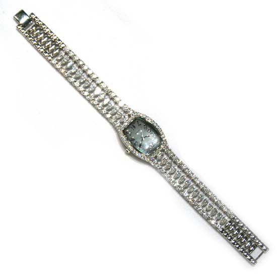 This classy sterling silver analog watch features a watch dial with Arabic numeral markers. The bezel and the strap are all embedded with cubic zirconia stones, which shine in dazzling radiance. The stunning watch also comes with a jewelry clasp for elegance.