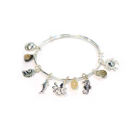 This is a bangle with a sophisticated and unique appearance. It is adorned with assorted charms for added style. This bangle is mainly made of 925 sterling silver.