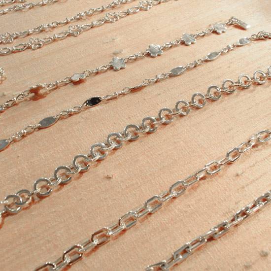 These bracelets and necklaces are made of sterling silver. They have shiny finish. There are various design available.