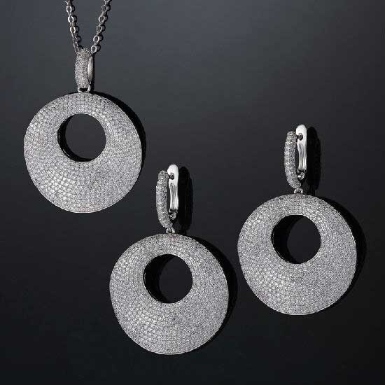 This is a series of jewelry that includes a necklace and a pair of earrings. Each piece features a big circle embellishment with sparkling CZ stone paved on it. Charming and eye-catching, this series surely is an ideal accessory for your evening outfit.