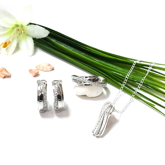 This sterling silver jewelry set comes with a pair of earrings, a ring and a pendant. They are made with exquisite craftsmanship. The jewelry set is perfect for cocktail parties and semi-formal occasions.