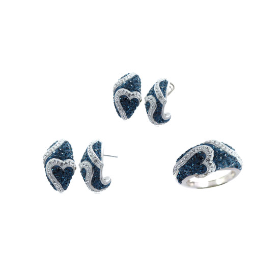 This is a sterling silver jewelry set with two pairs of earrings and a finger ring. It is crafted with dazzling crystals for added glamor. This silver jewelry set is easy to mix and match with your outfits.