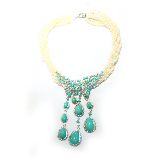 This sterling silver necklace features multiple strands of white, glossy CZ stones. It is hung with huge synthetic turquoise stones in clean pear cuts. Featuring a substantial appearance, this necklace looks grand and presentable along your neckline.