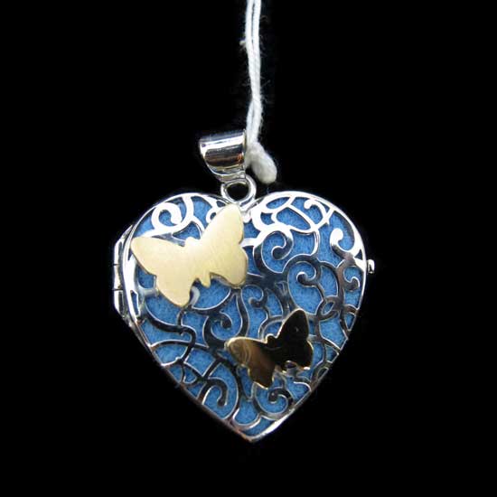 This elegant silver pendant goes well with your daily wear. The blue internal part is cover by a polished casing with sophisticated cut-outs. It is decorated by two golden butterflies placed on its surface.