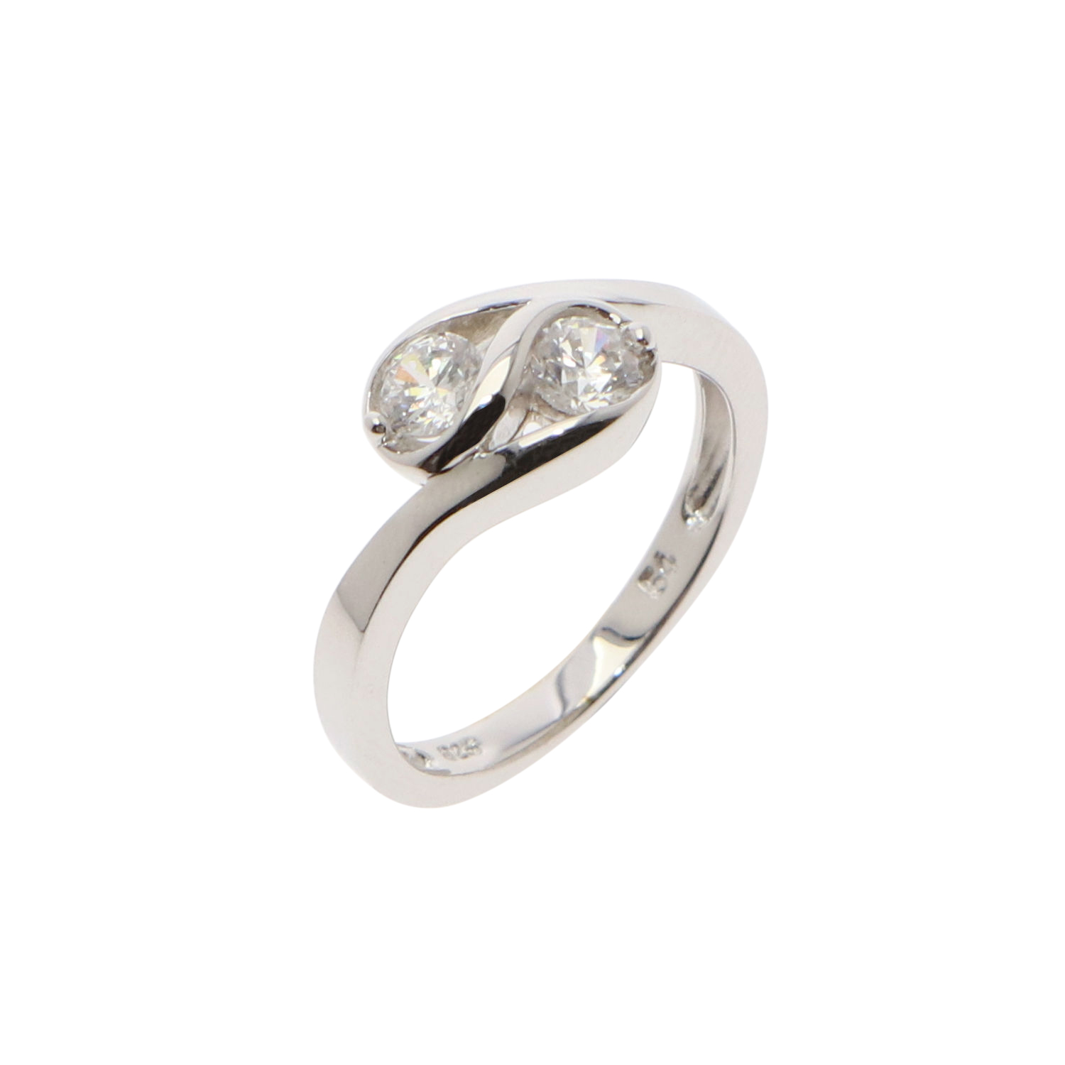 This 925 sterling silver ring features two white cubic zirconia stones on an interlocking band. It is excellent as a symbol of love and makes a meaning gift for someone important. The ring is rhodium plated for added luster and can deliver a long lasting shiny look.