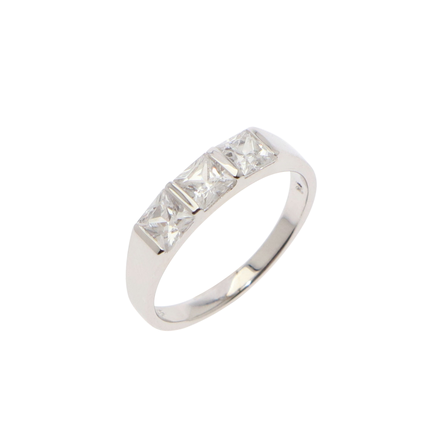 - Set with 3 white cubic zirconia stones in square cut.
