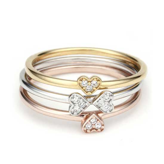 This is a ring set made of sterling silver in two colors. With a stackable design, the rings can be worn together for a fashionable look. This sterling silver ring set has sparkling stone centerpieces in a heart shape.