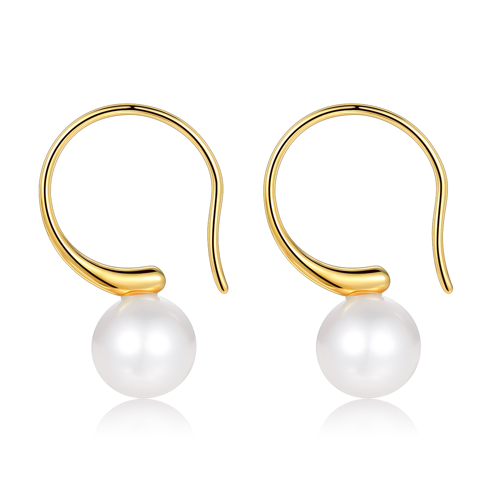 STERLING SILVER EARRINGS WITH 9-9.5MM white ROUND FRESHWATER PEARL, YELLOW GOLD PLATED IN 2.5 MICRON