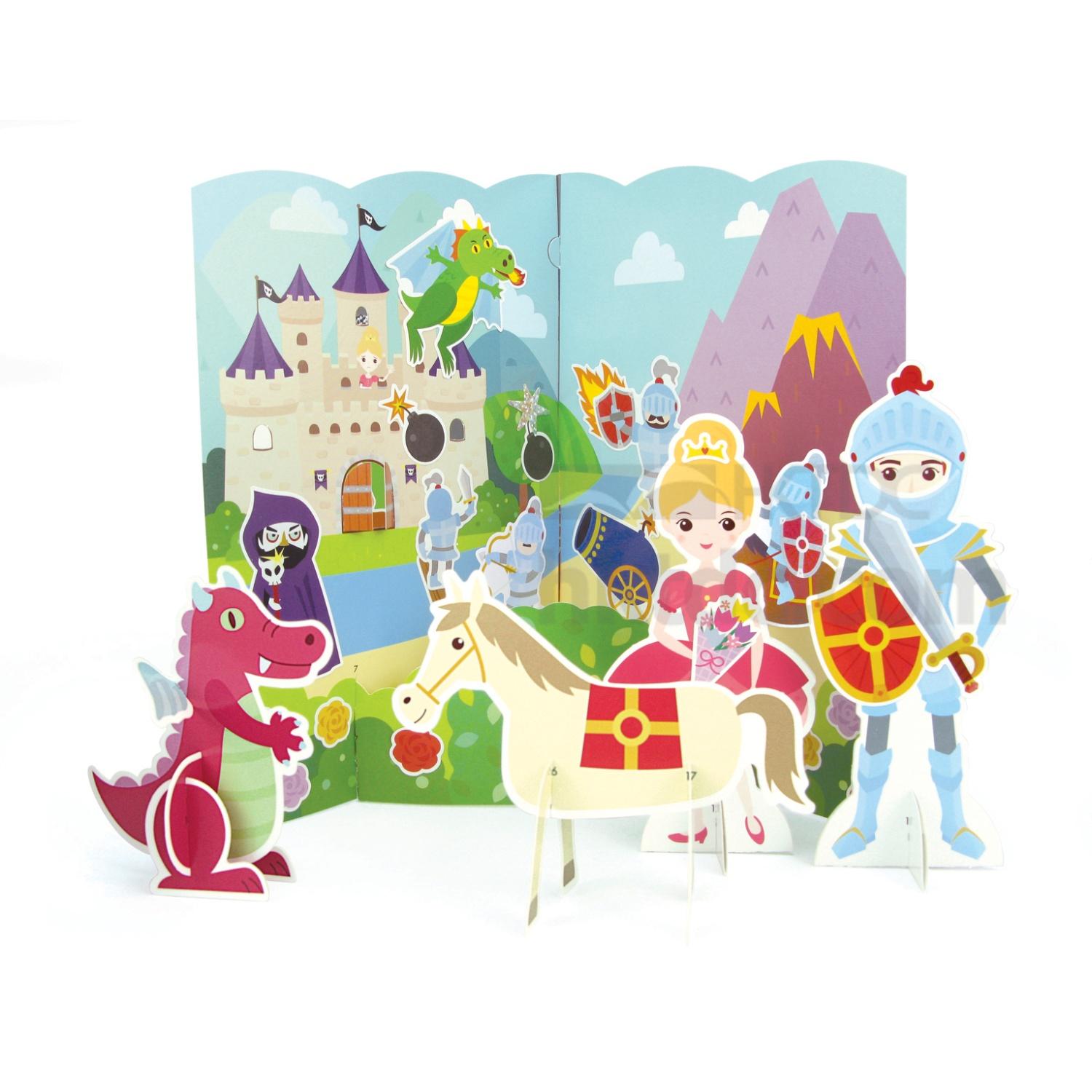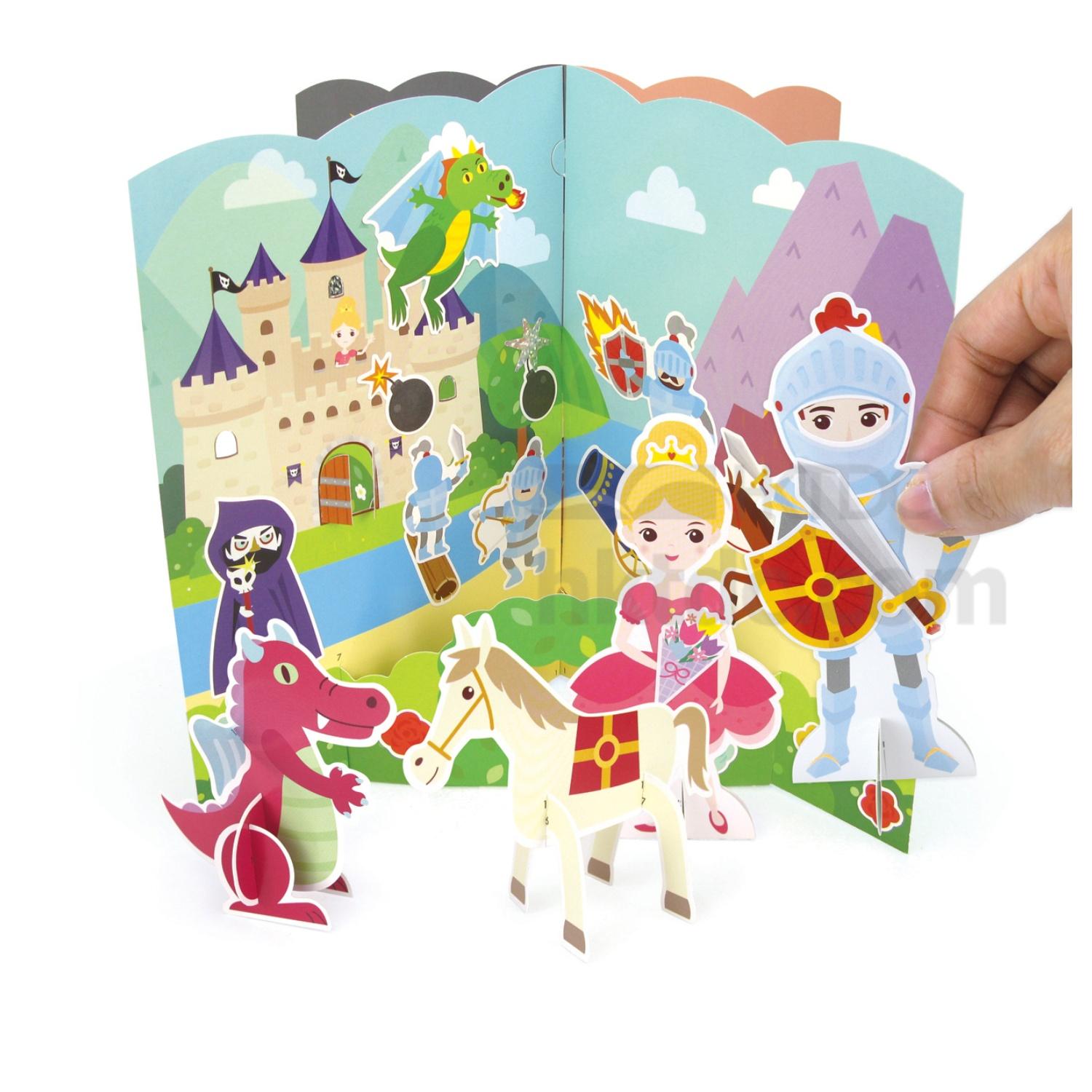 Spark your children’s imagination with this sticker game. This sticker card game comes with a standing rectangular board printed with a scene presenting a princess trapped in a castle attacked by a dragon. It also includes standing figurines of a lovely princess, a fire-breathing dragon, a chivalric knight and a horse so your kids and their friends can take up different roles and imagine various storylines to go with the scenes and characters. Let your child be a knight in shining armor or a fierce dragon with this sticker set.