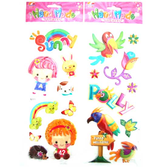 These are sticker sets for kids. Each set comes with a different theme. One set features cartoon girls and pets. Another set comes with lovely cartoon birds and appealing flowers. The stickers are nicely adorned by glittering plastic.