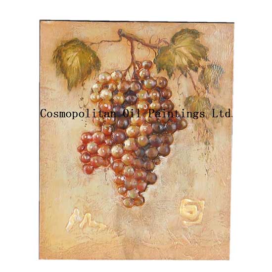 Featured is an oil painting showcasing a bunch of pearl-like grapes. The washy background in beige brings a nostalgic vibe and further directs eyes to the centered grapes. Every leaf and fruit is drawn with great precision to ensue an authentic look.