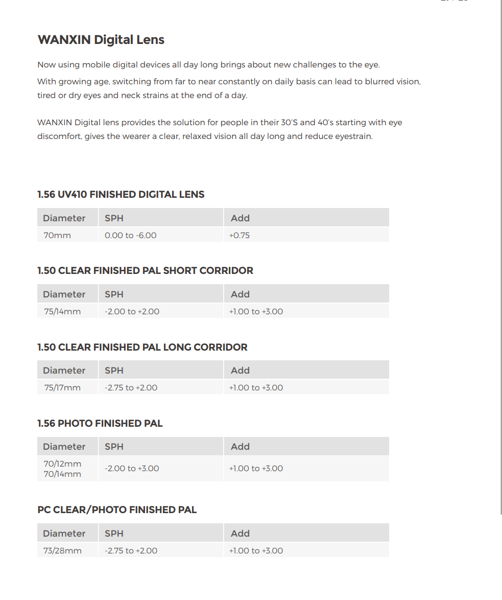 Now using mobile digital devices all day long brings about new challenges to the eye. With growing age, switching from far to near constantly on daily basis can lead to blurred vision, tired or dry eyes and neck strains at the end of a day. WANXIN Digital lens provides the solution for people in their 30’S and 40’s starting with eye discomfort, gives the wearer a clear, relaxed vision all day long and reduce eyestrain.