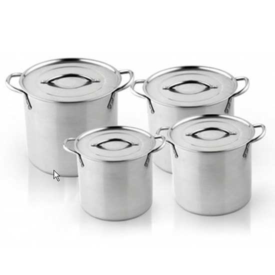 The stock pot set has four pieces in different sizes. The pots are made of fine steel, offering a long lifespan. The handles are sturdily fixed, offering reliable carrying. The lids are made of thin steel, offering easy lifting.