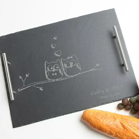 Bring a sense of natural simplicity to the table setting with this black display board. This square-shaped slate tray combines a sturdy construction and two stainless steel handles to offer a secure grip, making it perfect for serving set meals with appetizers, main course, dessert, and drink.
