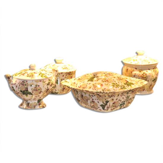This is a stoneware bowl and cover set. The ceramic tableware are nicely painted with delicate organic motifs of flowers and leaves. With a glossy finish, the stoneware utensils are very nice looking and they are suitable as precious gifts.