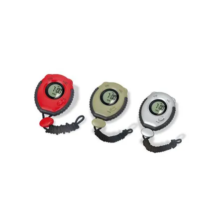 Displayed is a stop watch featuring 3 colors for your preference. It accurately measures the duration of time intervals. It is fitted with a long lanyard to hang on your neck.