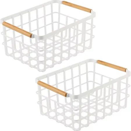 Metal Wire Food Organizer Storage Bin Basket with Bamboo Handles for Kitchen Cabinets