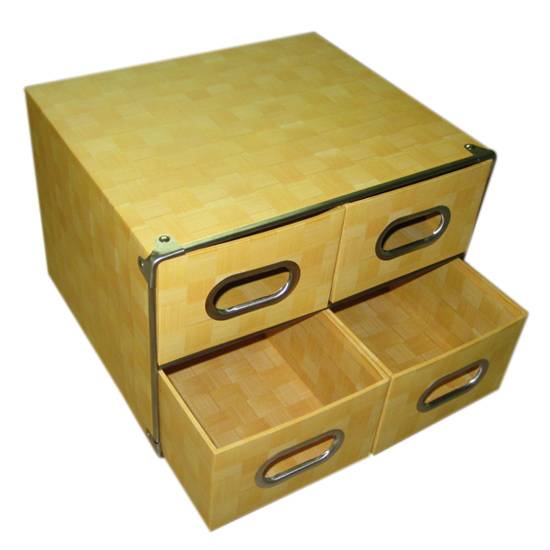 The storage box is mainly in yellow colour. It has four sliding drawers with metal handle. It has grid pattern printed.