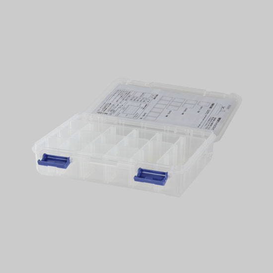 This is a storage box with a transparent body. Featuring multiple compartments, this storage box is versatile and easy to use. The snap closure makes this storage box a user-friendly choice.