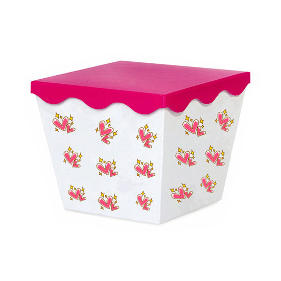 This is a storage box with heart patterns. The scalloped edge of the red cover adds a unique touch to the box. It is a durable storage box for household use.