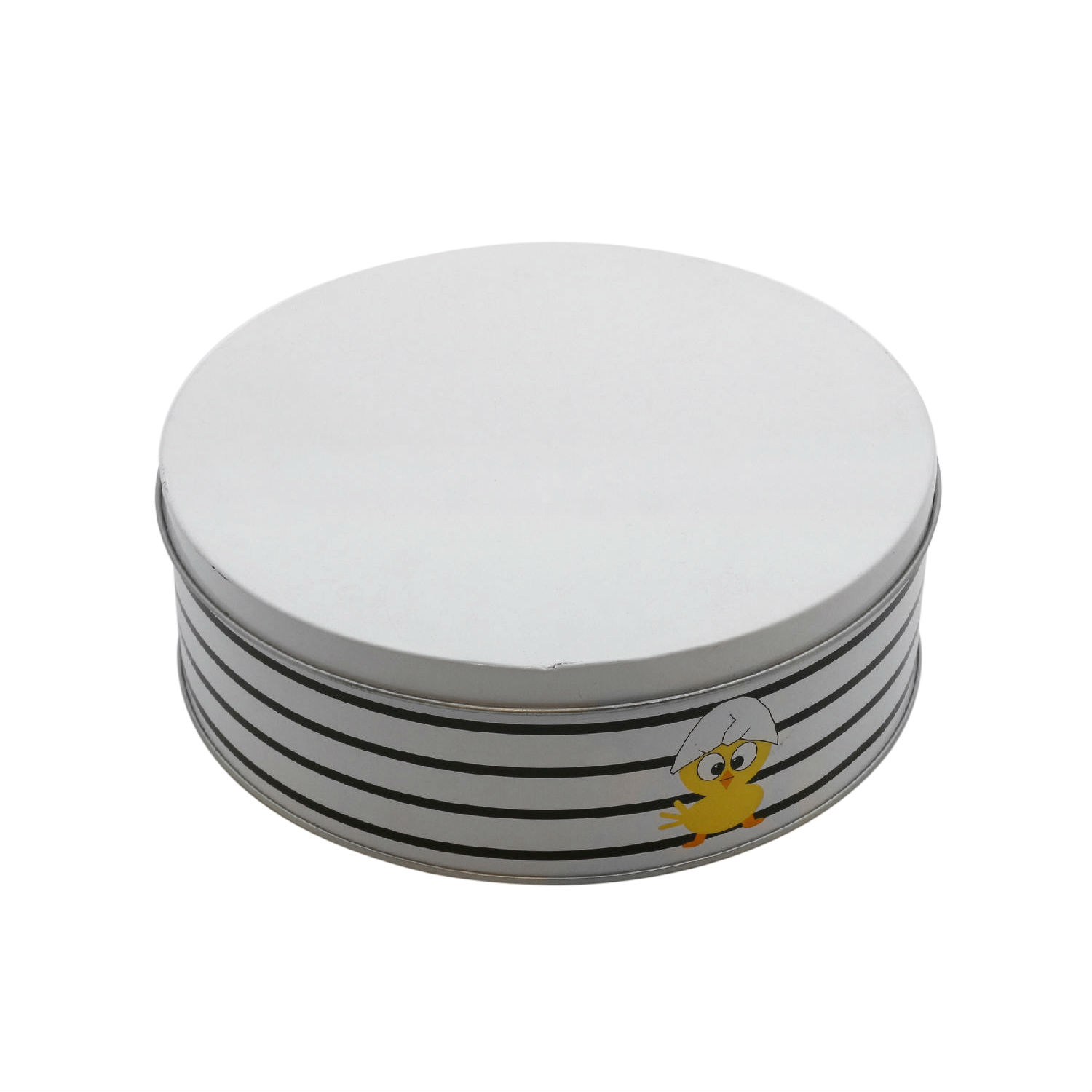 This storage tin is crafted of metal, featuring a round shape and a roomy interior. The navy stripes and adorable cartoon character print renders a cheerful touch to the tin. Coming with a slip-on cover, this storage box can be used for a variety of applications.